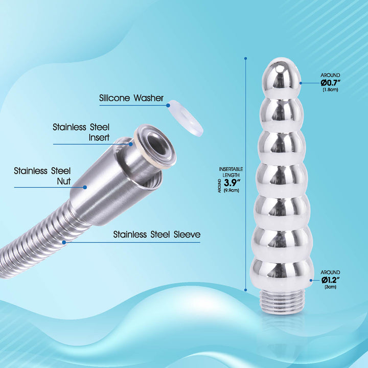 With an insertable length of 9.9cm and a minimum insertable diameter of 1.8cm, this shower douche is perfect for a gentle cleanse. The metal nozzle, stainless steel hose, and silicone washers are all high-quality materials that are safe for use in the shower.