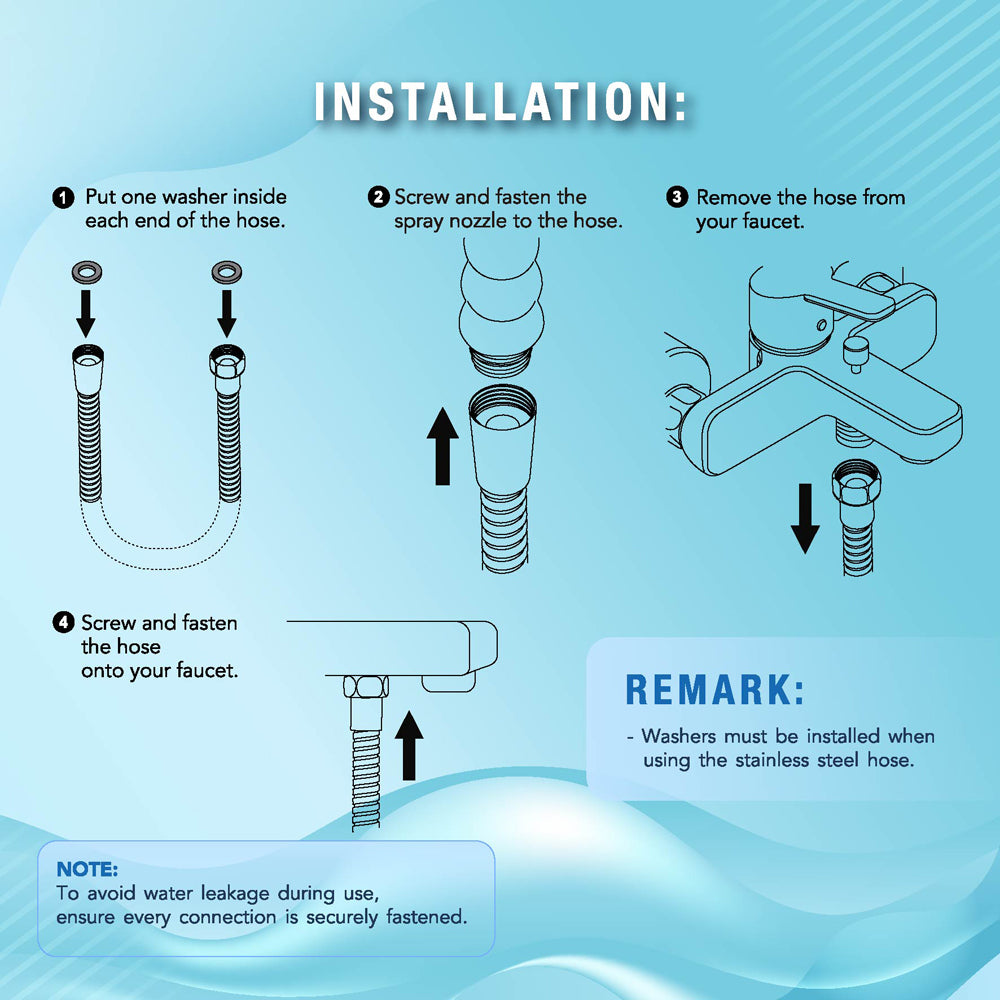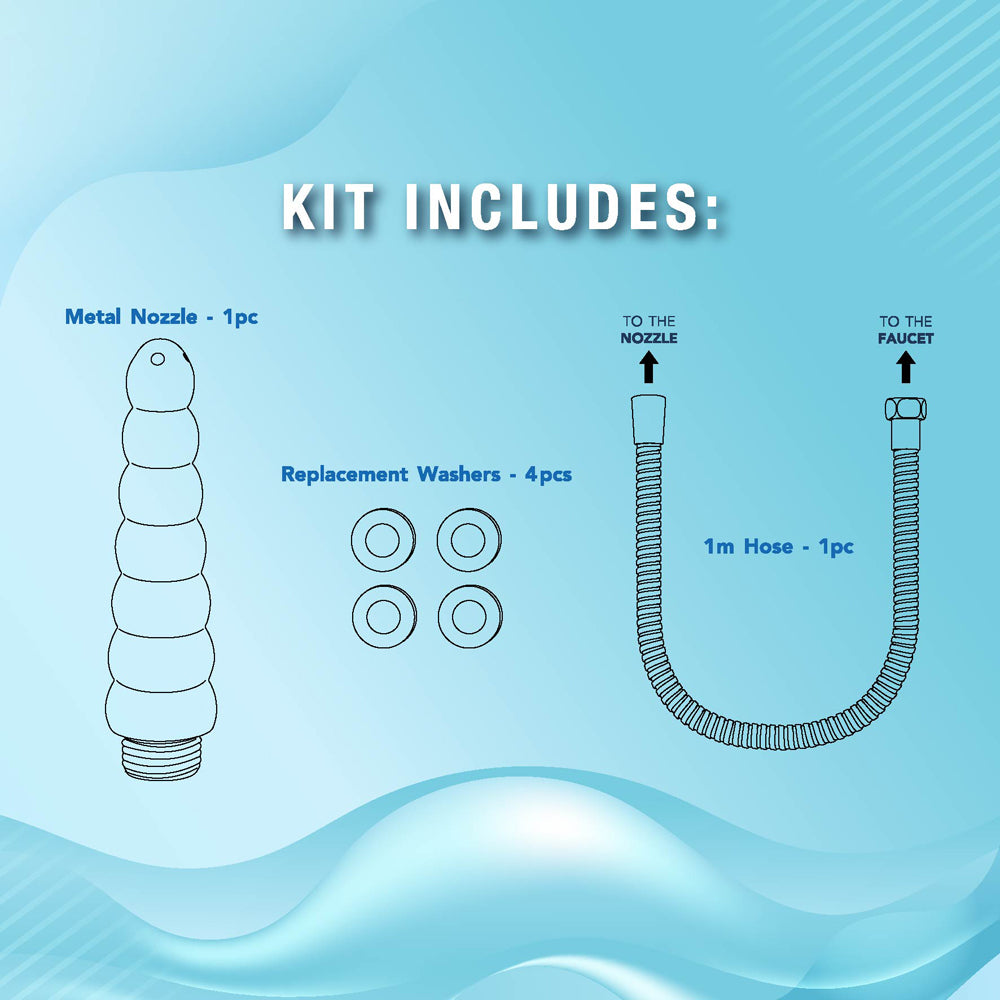 The kit includes a 1-meter flexible stainless steel standard shower hose, complete with silicone washers for a secure fit. The tapered beaded shaped nozzle features a multidirectional spray at the tip, ensuring a thorough clean every time.
