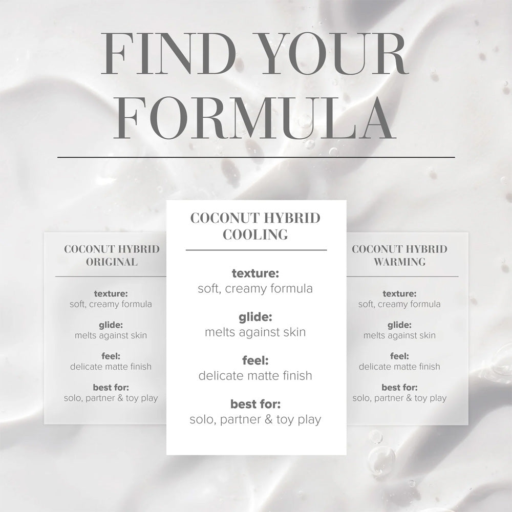 Hybrid lubricant combines both water and silicone-based formulas, providing the long-lasting benefits of silicone with the easy cleanup of water-based options. One of the most popular hybrid lube formulas we stock from JO is the Coconut Hybrid Cooling Lubricant.This 120ml blend of coconut oil and water-based ingredients offers a gentle cooling effect. With a smooth, non-greasy formula, it provides the perfect glide for solo or partnered play and is safe to use with most toys.