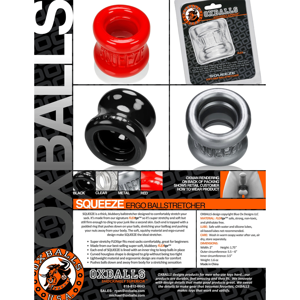 We pride ourselves on using only the best materials, and the Oxballs Squeeze Ball Stretcher is no exception. Made from our best-selling super-soft and blubbery FLEXtpr, this stretcher provides a completely new and exciting stretching sensation compared to silicone products. It's lightweight and compact, allowing you to wear it during your daily routine or for some intense sweaty ball-slappin' sessions.