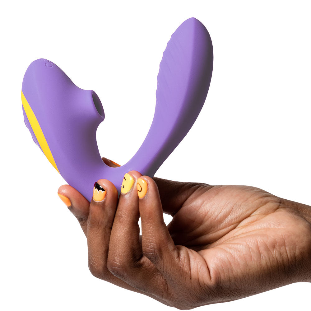 ROMP Reverb is a rabbit vibrator with Pleasure Air Technology. This includes an internal G-spot vibrator arm and an external clitoral suction stimulation head, which combine to give two types of stimulation, both inside and out, for powerful, blended orgasms. It offers 10 suction levels, 3 vibe speeds, 7 vibe patterns, and a travel lock. It’s rechargeable and waterproof.