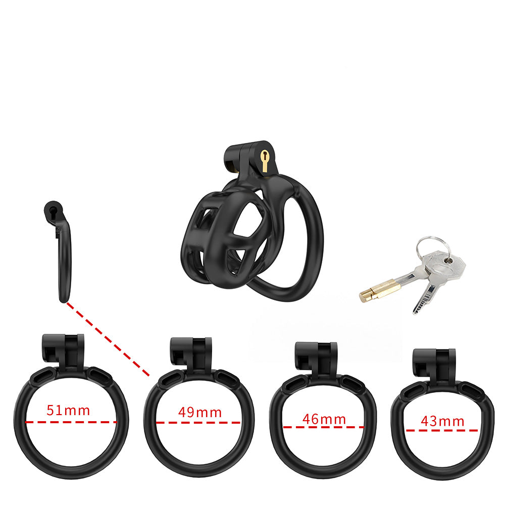 With four ergonomically shaped cock rings included, you can be sure that your CELLMATE Guardian Chastity Cage will fit securely and prevent any unwanted escapes. The various ring diameters of 43 mm, 46 mm, 49 mm, and 55 mm ensure a perfect fit for every man.