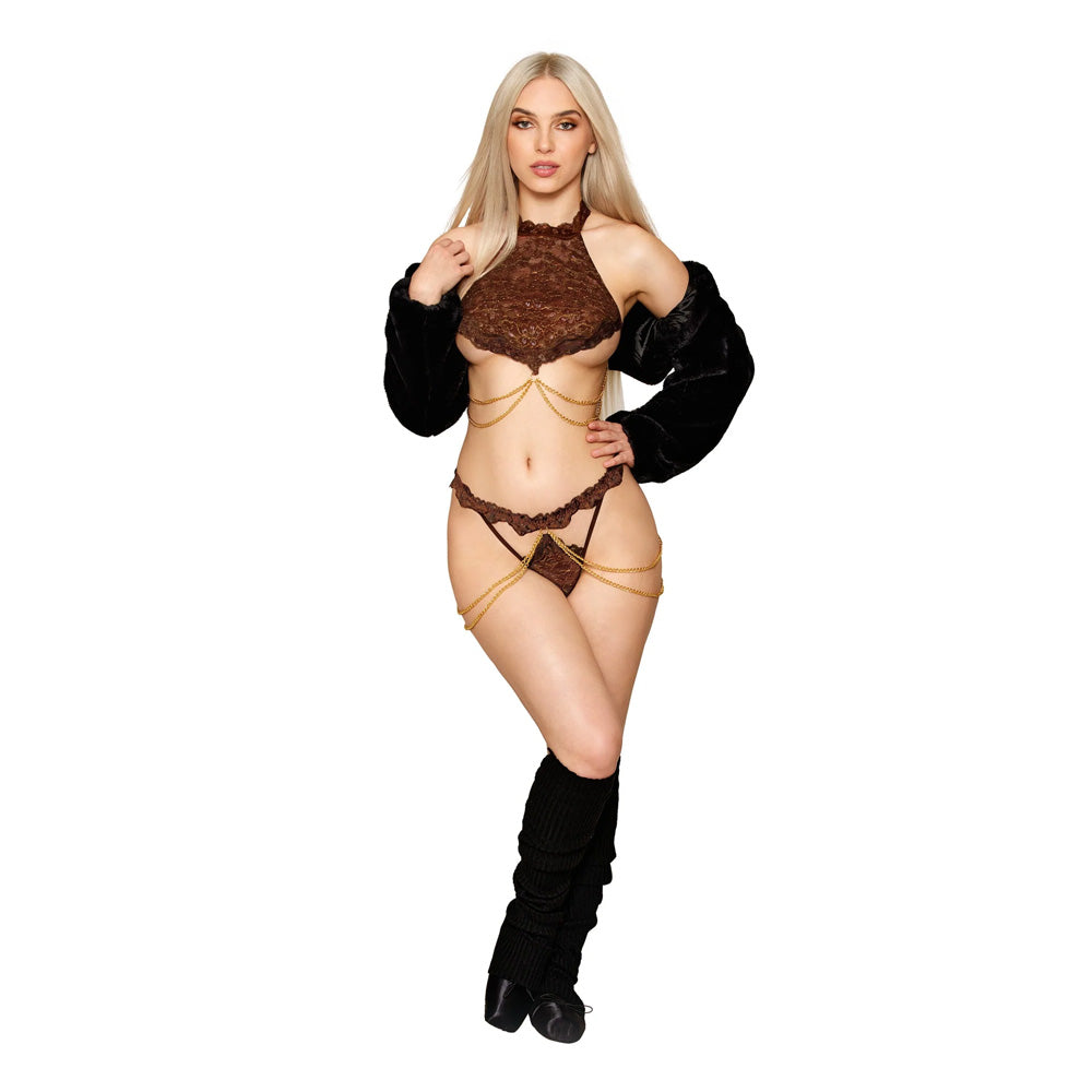 Dreamgirl Iridescent Stretch Lace Halter Bralette, G-String Set Espresso - 13082
