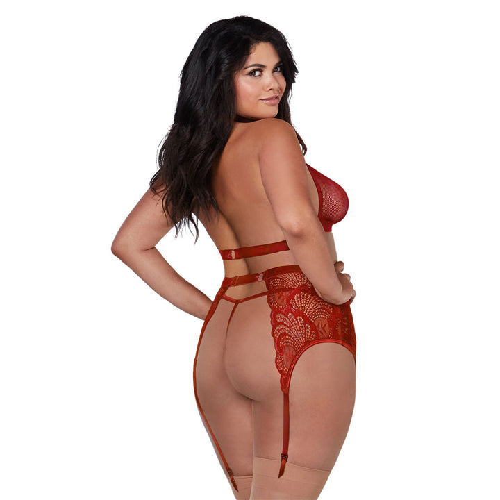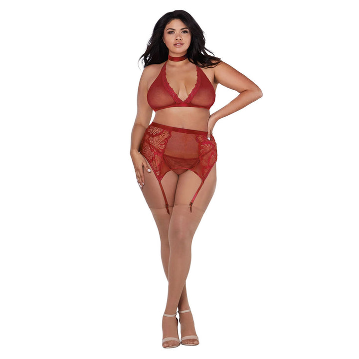 Dreamgirl Lingerie Fishnet & Lace Velvet Trims Halter Bralette & Garter Belt Garnet 11776X