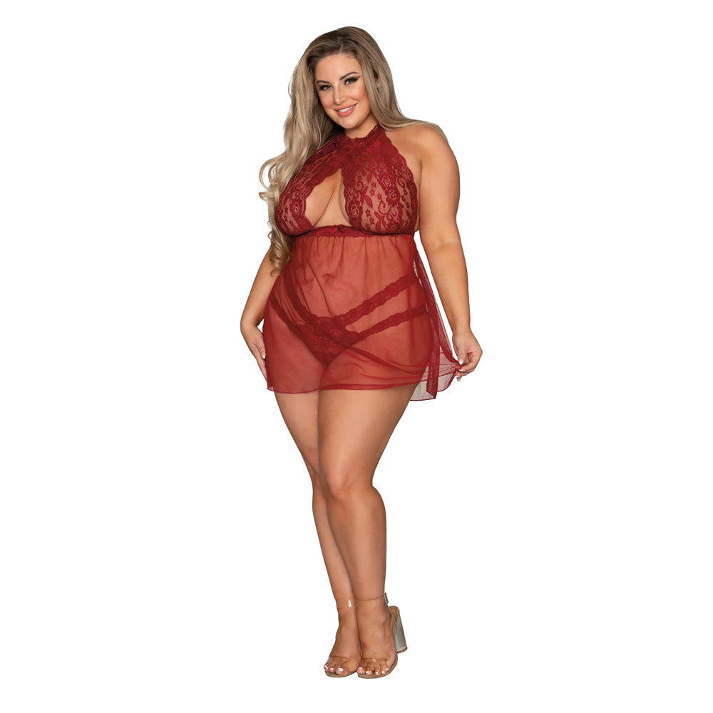 Dare to dazzle in our Dreamgirl Plus Size Stretch Lace and Mesh Babydoll in vibrant garnet. This enticing ensemble pairs delicate lace with airy mesh, creating a tantalizing duet of textures that whisper sweet nothings to your curves.