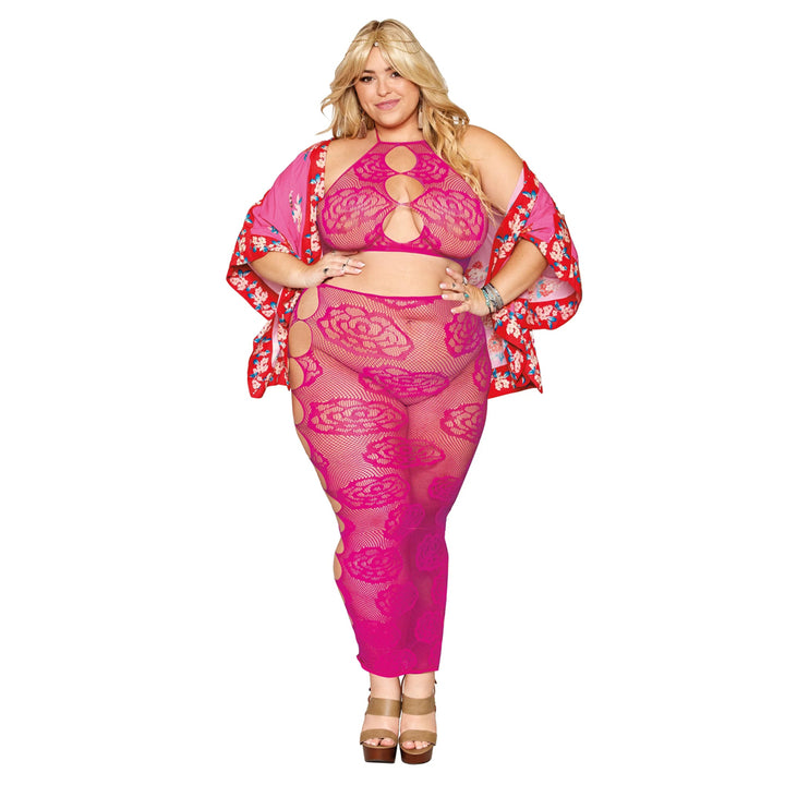 Hey there, curvy queens! Looking for a sexy set that's sure to turn heads? Look no further than the Dreamgirl Plus Size Bralette Skirt Set in Rose Fishnet - Beet. This stunning set features a seamless bralette and long skirt with a knitted large rose and fishnet pattern that's both sultry and stylish.
