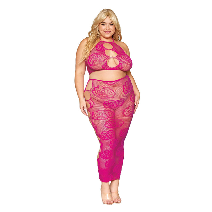Dreamgirl Plus Size Bralette Skirt Set Rose Fishnet 0485X - Beet