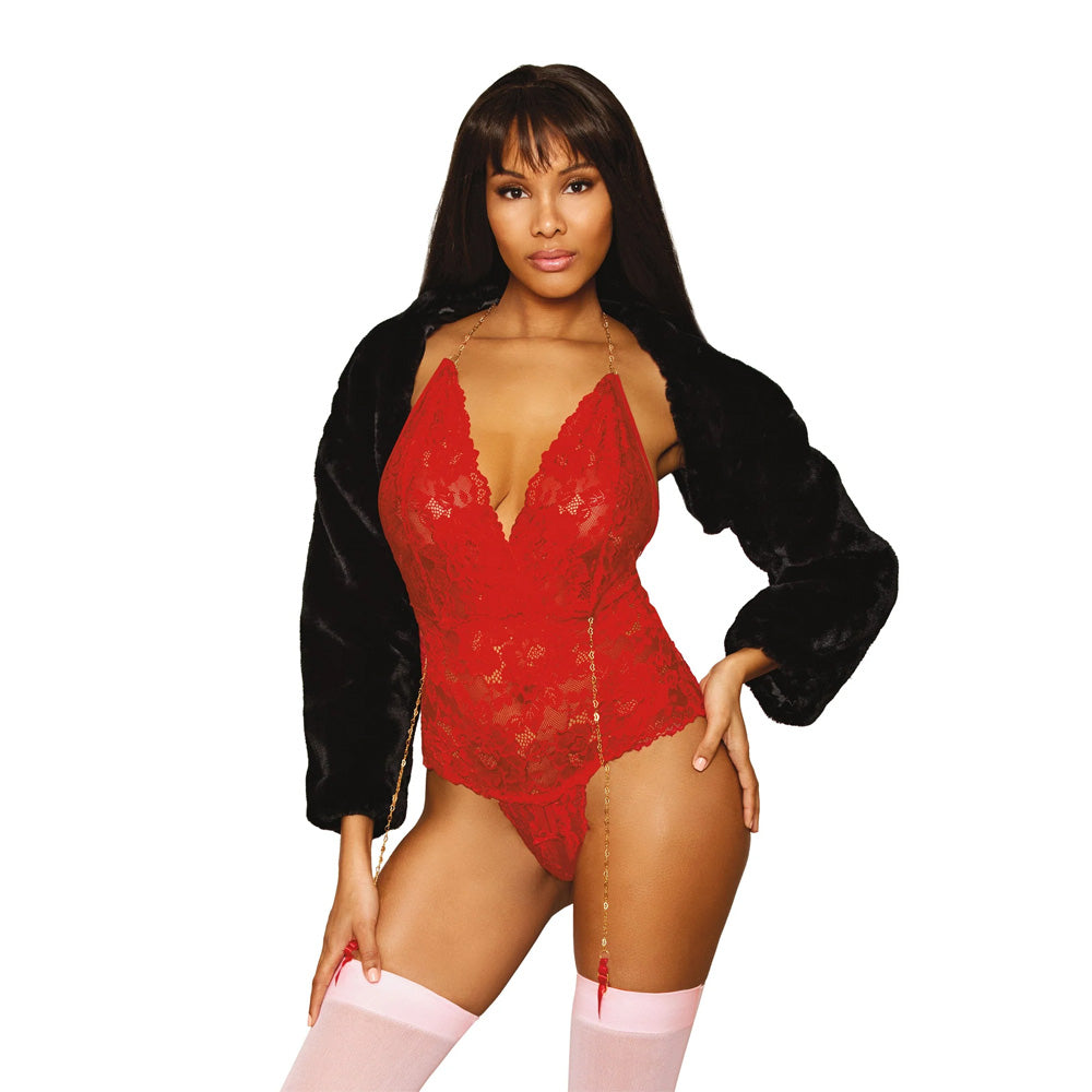 Indulge in the ultimate fantasy with the Dreamgirl Stretch Lace Garter Teddy in Ruby. This exquisite piece features stunning metal heart chain details that add a touch of glamour and allure.