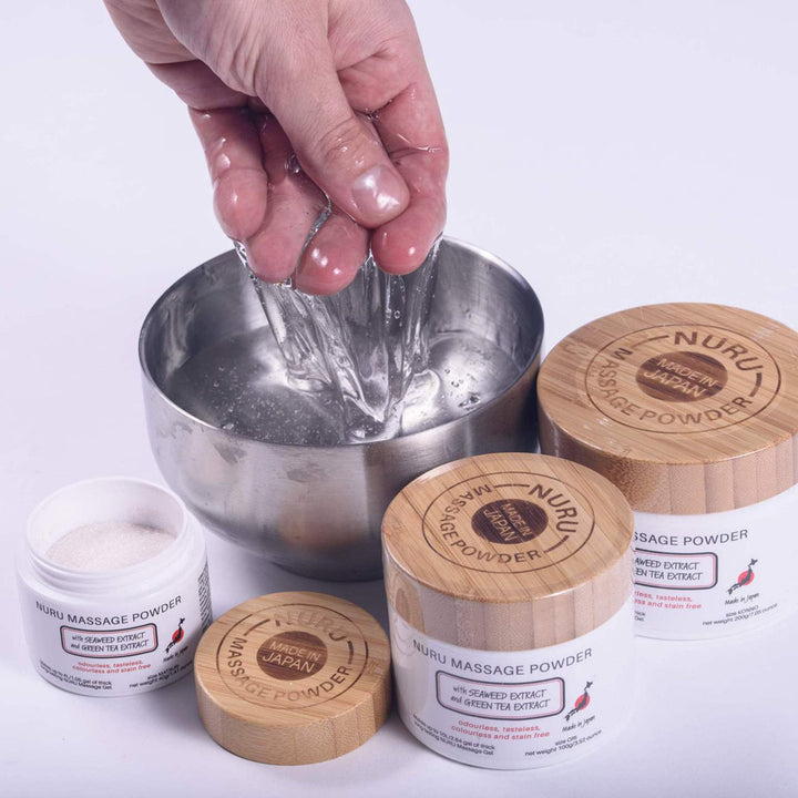 Crafted in Japan, the birthplace of the Nuru massage, our Eroticgel Nuru Massage Gel Powder brings you a slice of this traditional sensual art, all while caring for your skin. Experience a truly authentic Nuru massage and unveil new heights of sensual pleasure with our Seaweed and Green Tea infused gel powder.
