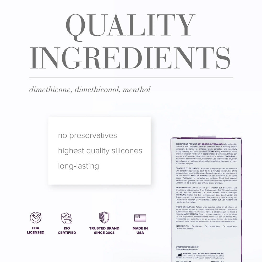 Housed in a portable 10ml bottle, which converts to a neat 0.34 fluid ounces, the JO Arctic Clitoral Stimulant induces an intense cooling sensation that lasts up to an exhilarating 45 minutes. It's a preservative-free powerhouse, containing the highest quality silicones for an unforgettable journey of pleasure.