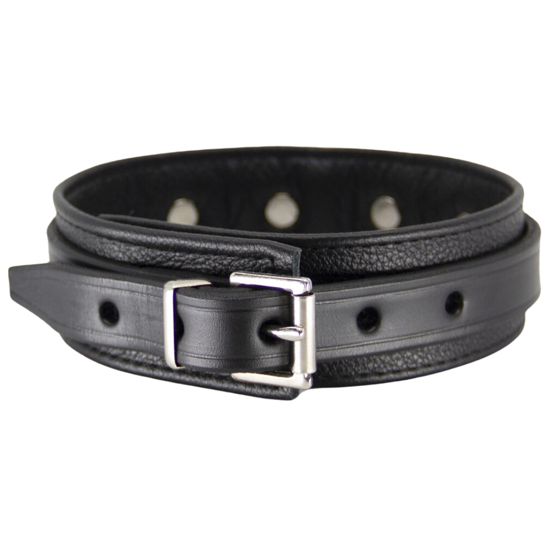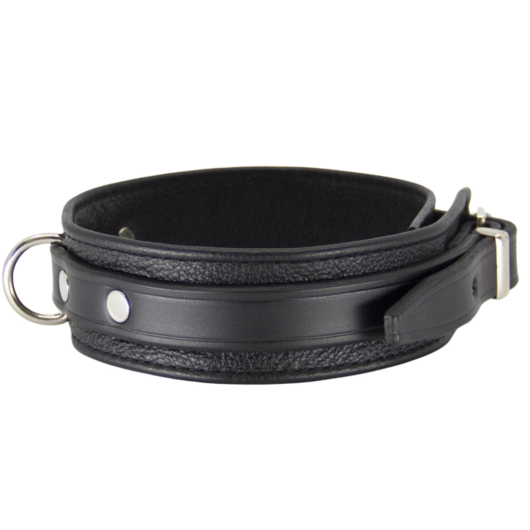 The collar is adorned with nickel plated chrome coloured hardware, giving it a sleek and sophisticated look. It fastens securely with a buckle closure and keeper, ensuring that it stays in place, even during the most adventurous playtime sessions.