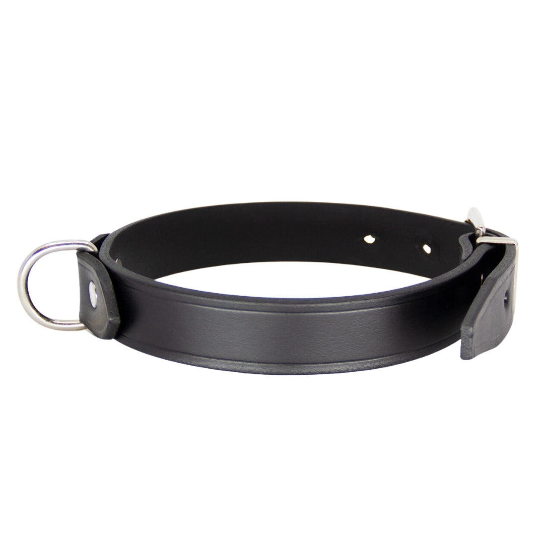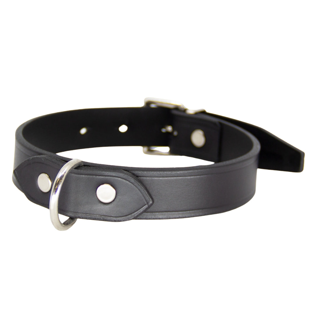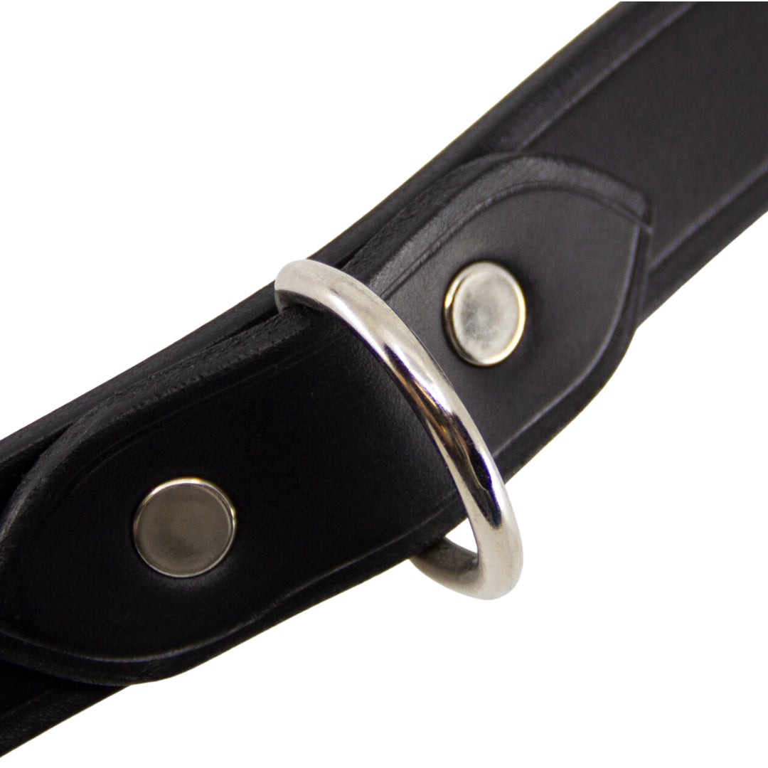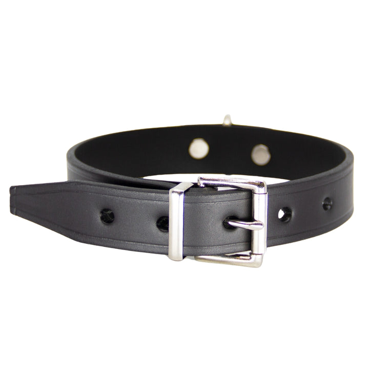 Designed with a centre dee for easy attachment of restraints or a lead, this collar offers both style and functionality. The durable nickel plated chrome hardware ensures that this collar will withstand even the most intense play sessions. The 1" centre dee is secured with double capped rivets for added security.