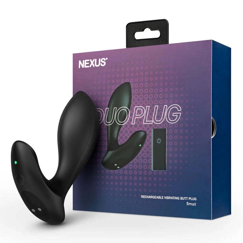 Introducing the Nexus Duo Plug in a sleek black color! This small vibrating butt plug is designed for maximum comfort and satisfaction, making it a must-have for all pleasure seekers. Made with firm yet flexible silicone, this toy offers a luxurious and velvety feel.