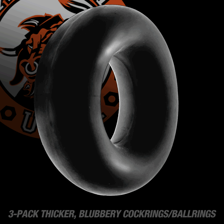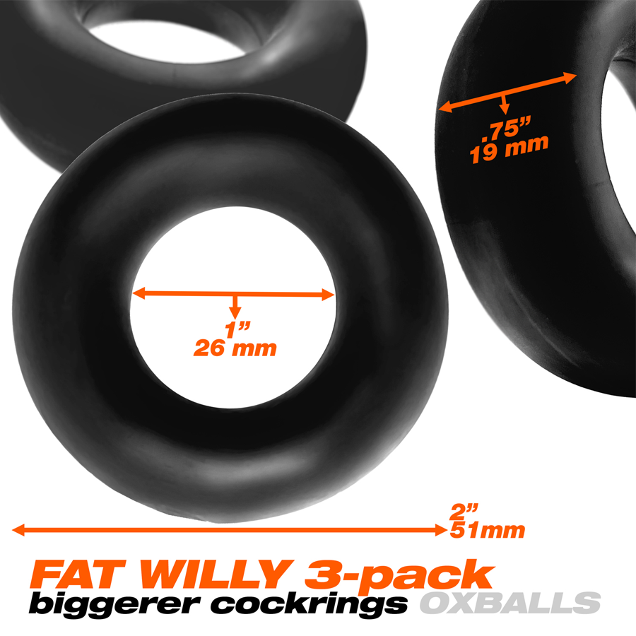 The Fat Willy's are shaped to provide the perfect grip, whether you prefer it soft or hard. These max-grip cockrings will not roll thanks to their unique design - they flatten out as you stretch, ensuring they stay exactly where you put them. With no rolling, there's no pinching, allowing you to enjoy maximum bone hardness.Made from our softest, rubbery, and incredibly stretchy Flextpr™ material, these rings offer unparalleled comfort and durability. At Oxballs, we pride ourselves on testing our gear and using our toys, and we believe these rings are the best size and fit we have to offer. For those who like to take it a step further, you can even stack these rings on your nutbag for a gradual rubbery stretch that you can control.We're all about color at Oxballs, which is why the Fat Willy's are available in two exciting new options. The Space Blue is a smokey dark translucent blue that is deep and rich, while the Steel color resembles stretchy metal - a dark reflective metallic smoke that's way cooler than boring black. Our goal is to provide you with the absolute best designs in colors that make your intimate moments look even better!Rest assured that all original design copyrights belong to Oxballs, so you know you're getting a unique and authentic product. Furthermore, our Flextpr™ material is phthalate-free, scent-free, and made to provide the right grip without any pinching.When it comes to lubrication, we recommend using water-based, hybrid, or silicone lube for the best experience. Please avoid oil-based lubricants as they are not suitable for use with our rings.Taking care of your Fat Willy Rings is a breeze. Simply wash them after use in warm soapy water and let them air dry. For storage, we suggest keeping them separately in breathable cloth pouches or, for larger toys, in cotton socks.Now, let's talk about the dimensions. The Fat Willy Rings have a height of approximately 0.75"/19mm, a width and length of 2"/51mm, an outside circumference of 6.5"/165mm, an outside diameter of 2"/51mm, an inside circumference of 3"/77mm, and an inside diameter of 1"/26mm.Upgrade your playtime with the Oxballs Fat Willy Rings 3 Pack Jumbo C Rings - Black. Get your hands on these amazing cockrings and experience pleasure like never before. FATWILLY- Approximate statsHeight: .75"/19mmWidth: 2”/51mmLength: 2”/51mmOutside circumference: 6.5”/165mmOutside diameter: 2”/51mmInside circumference: 3”/77mmInside diameter: 1”/26mm