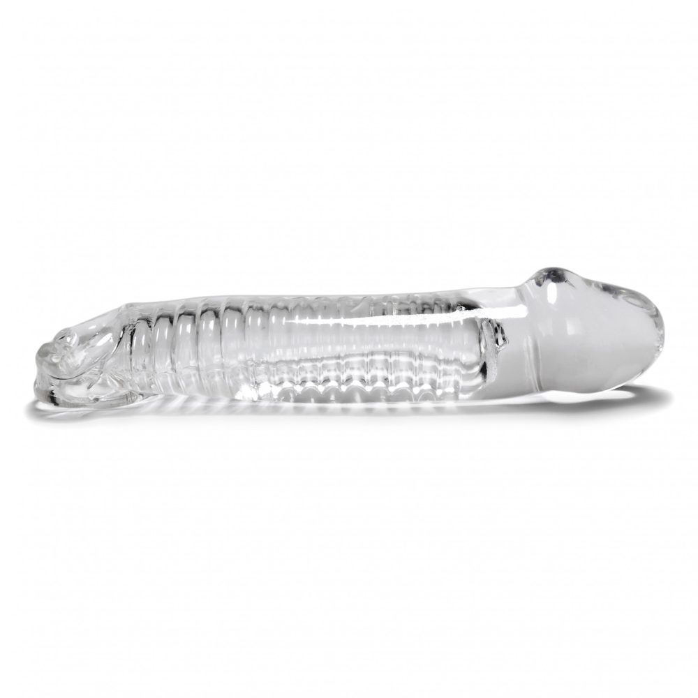 Introducing the Oxballs Muscle Cock Sheath - Clear. Get ready to flex your MUSCLE with this girthy cock sheath that will add thickness and length to any sized guy. Designed to mold onto you with a deep sucking sensation, the shaft is lined with ridges that stroke like a JO toy. And with our signature COCKSLING-2 base, this thick rubbery penetrator is guaranteed to stay in place no matter how hard you pump. Plus, for those who prefer a tighter fit, MUSCLE comes with a bullet insert to adjust the sheath accordingly.