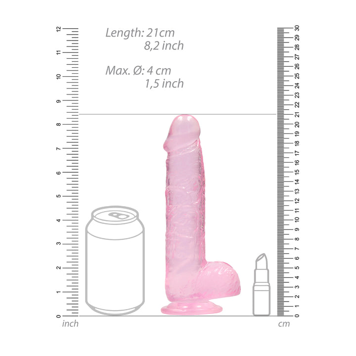 Introducing the Shots Real Rock Crystal Clear 8 Inch Dildo With Balls in a playful and pretty pink color! This dildo is here to take your pleasure to new heights with its realistic design and lifelike feel.