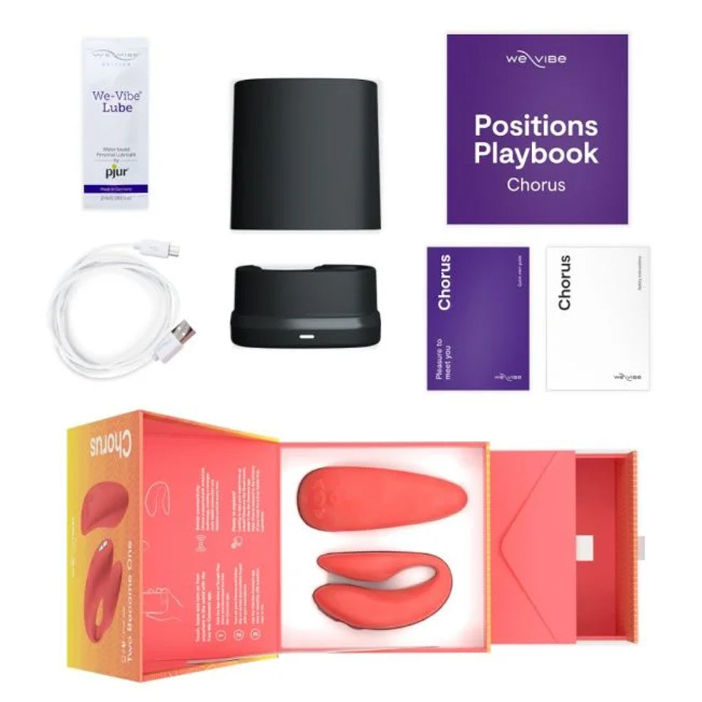 - Package Contents: Chorus, Squeeze Remote, Storage/Charging Case, USB charging cable, Quick-start user guide, We-Vibe Lube (made by pjur) 2ml Sample