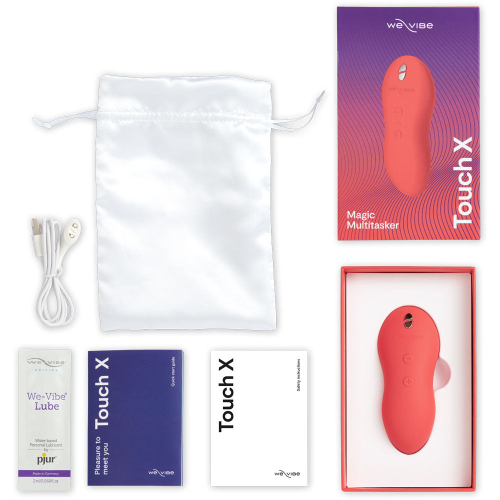 • Package Contents: Touch X, Satin storage pouch, USB charging cable, Quick-start user guide, Safety Guide, We-Vibe Lube (made by pjur) 2ml Sample