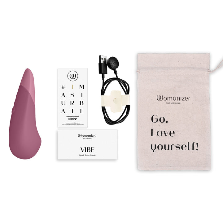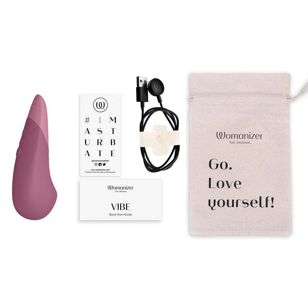 Experience the Womanizer Vibe in Dusky Pink for yourself and discover a new world of pleasure. With a run time of 90 minutes and a charge time of 90 minutes, this vibrator is ready whenever you are. The Vibe also comes with a cotton storage pouch, additional stimulation head, quick start guide, compliance and safety information, and even an #Imasturbate sticker. Available in three beautiful colors - Sage, Dusky Pink, and Dark Blue - the Womanizer Vibe is the perfect addition to your pleasure collection.